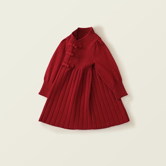 Girl's Red Knitted Long-Sleeve Dress - Festive Chinese New Year Outfit