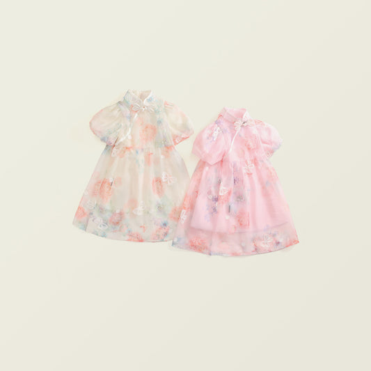 Girl's New Chinese-Style Bubble Sleeve Cheongsam Dress