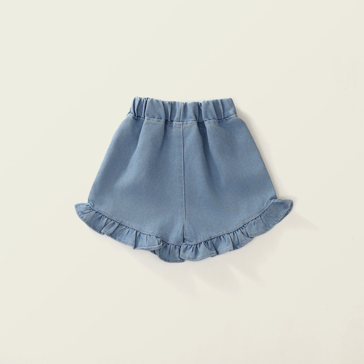 These adorable denim hotpants for girls are designed with a charming lace trim, adding a sweet and feminine touch to any outfit. Crafted for young children, these hotpants are made from high-quality denim material and come in solid colors that are easy to mix and match. Featuring a versatile and trendy Korean design, these shorts are perfect for warm weather and can be paired with various tops for a stylish and comfortable look.