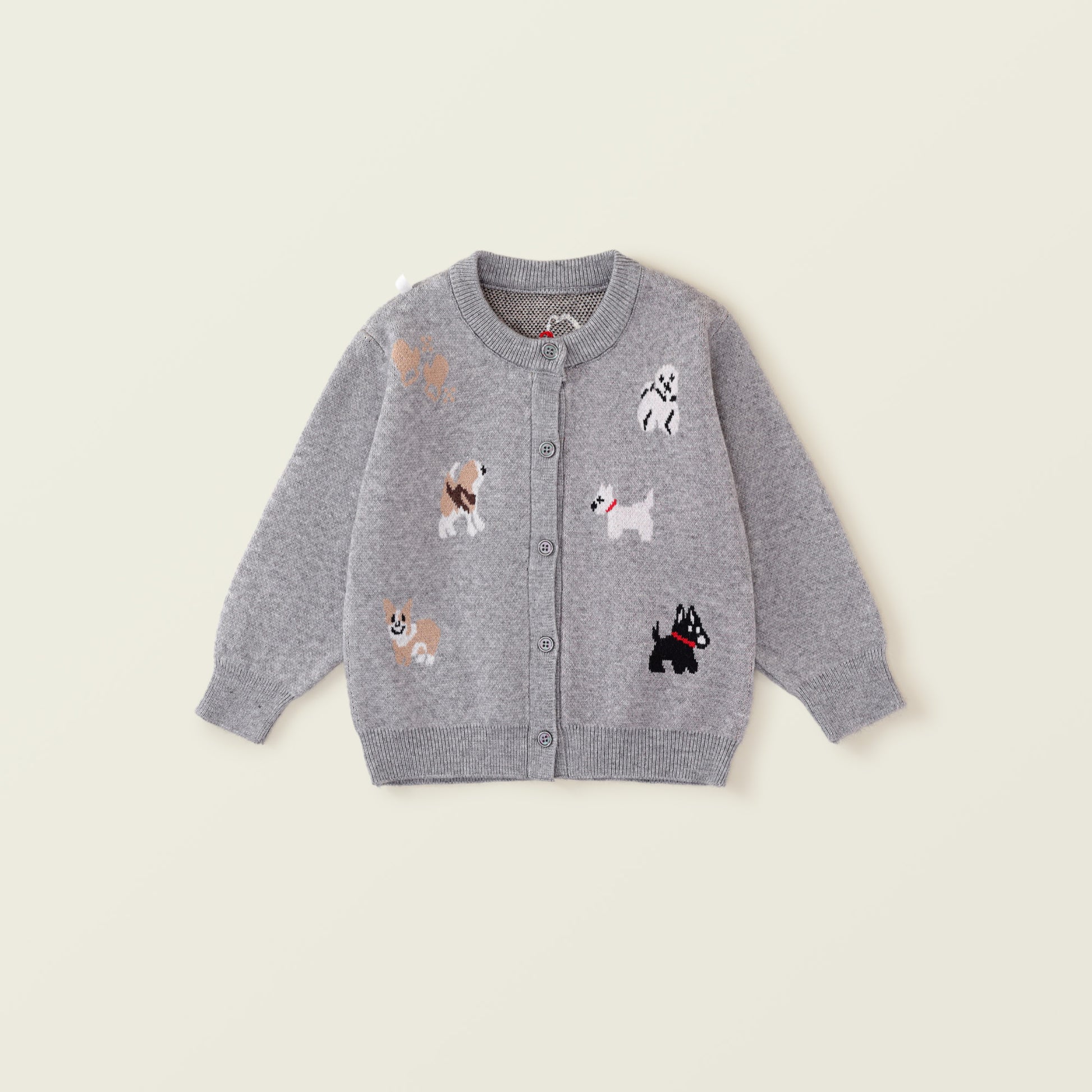 Keep your little one cozy and stylish this fall with our Girl's Gray Knit Cardigan! This 2025 fall new arrival features a classic round neckline, adorable puppy jacquard patterns, and a soft, comfortable knit fabric. Inspired by Korean fashion trends, this versatile cardigan is perfect for layering over dresses, tops, or tees, making it a must-have for the cooler season. Whether for school, playdates, or casual outings, this charming sweater will add a touch of warmth and cuteness to her autumn wardrobe!